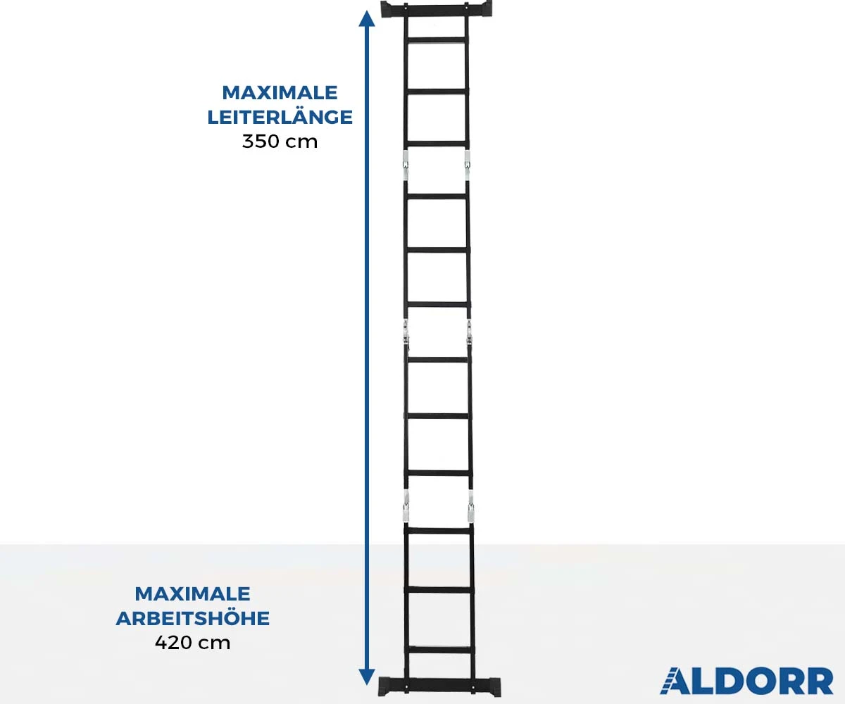 Die ALDORR Home Klappleiter mit Plattform ist die ideale Leiter für verschiedene Arbeiten und besteht aus 4 Segmenten mit je 3 Sprossen. Dank der hochwertigen, leichten Aluminiumkonstruktion wird jede Arbeit sicher und einfach. Die vielseitige Leiter kann auf verschiedene Weise verwendet werden, sowohl in der geraden Position, in der klappbaren Position (A-Position) als auch in der Plattformposition, wie auf den Bildern gezeigt. Der breite Stabilisierungsbügel bietet zusätzlichen Halt und Komfort bei der Benutzung der Leiter, und die Stufen haben eine rutschfeste Lauffläche für zusätzliche Stabilität. Die Leiter entspricht den strengen niederländischen Sicherheitsnormen: NEN2484 und EN 131.