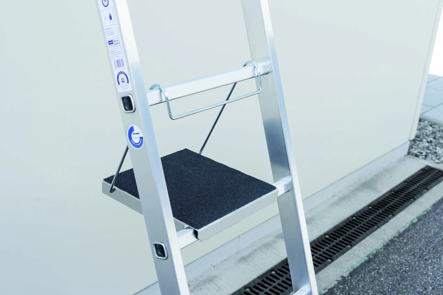 Nach TRBS 2121 Teil 2 wird zum Arbeiten auf dieser Leiter ein passendes Zubehör (Einhängepodest, Einhängetritt oder Stufenmodul) benötigt