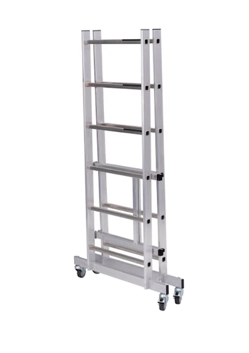 - Belagbühne kann am zusammengeklappten Gerüst für Transport und platzsparende Lagerung senkrecht eingehängt werden