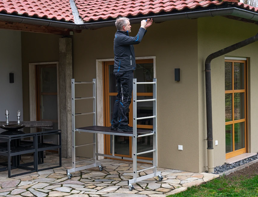 Das leicht verfahrbare und werkzeuglos aufstellbare Alu-FaltGerüst für gelegentliche Einsätze im Innenausbau