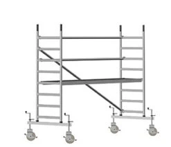 Die Fahrgerüste des Herstellers Ernst mit Rundsprossen entsprechen einer extra stabilen Industrieausführung. Der Aufbau ist kinderleicht, da es sich um einfache Steckverbindungen handelt. An den Diagonalen und Horizontalen (Geländer) sind Aluminiumklauen angeschweißt, welche formschlüssig über der Rundsprosse liegen. Eine spezielle Sicherung verhindert versehentliches Aushängen.