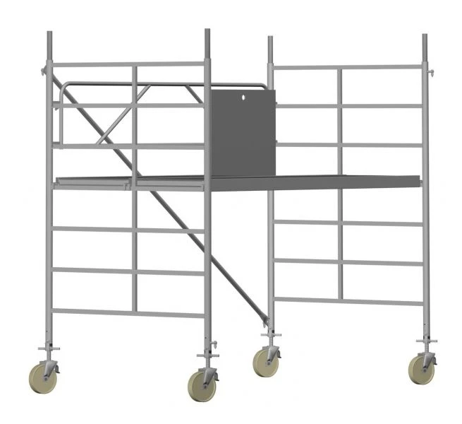 Die Fahrgerüste des Herstellers Ernst mit Rechtecksprossen entsprechen einer äußerst robusten Handwerkerausführung. Der Aufbau ist kinderleicht, da es sich um einfache Steckverbindungen handelt. Die Diagonalen werden an Bolzen mit Fallzunge, welche am Ständerrohr angeschweißt sind, eingehängt.