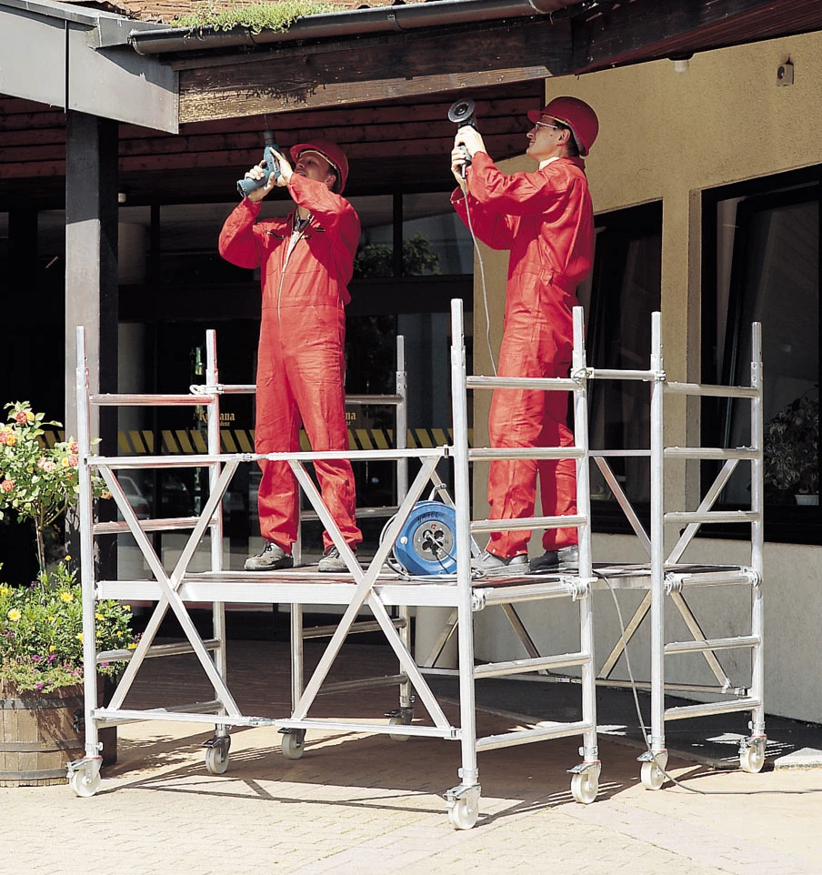 - Durch zusätzliches Zubehör in Verbindung mit zwei Faltgerüsten können sehr große Arbeitsflächen geschaffen werden