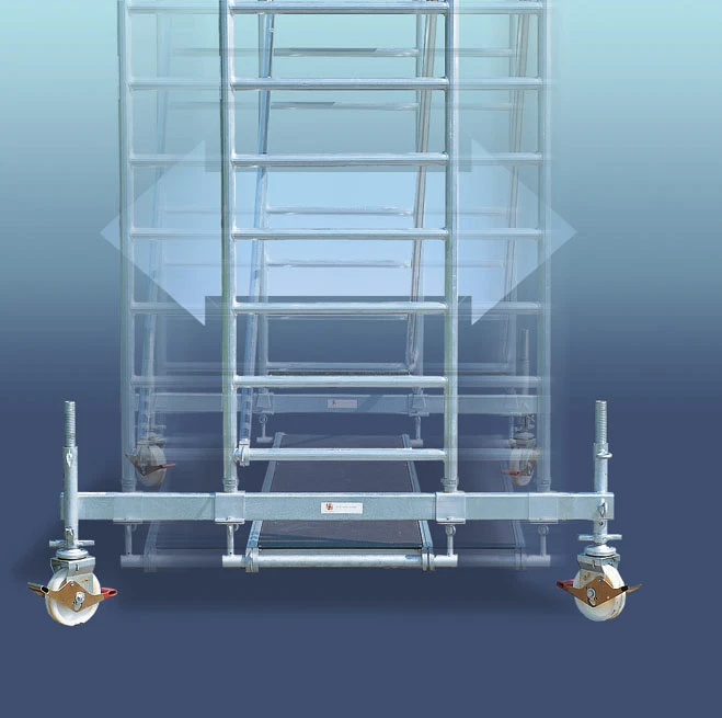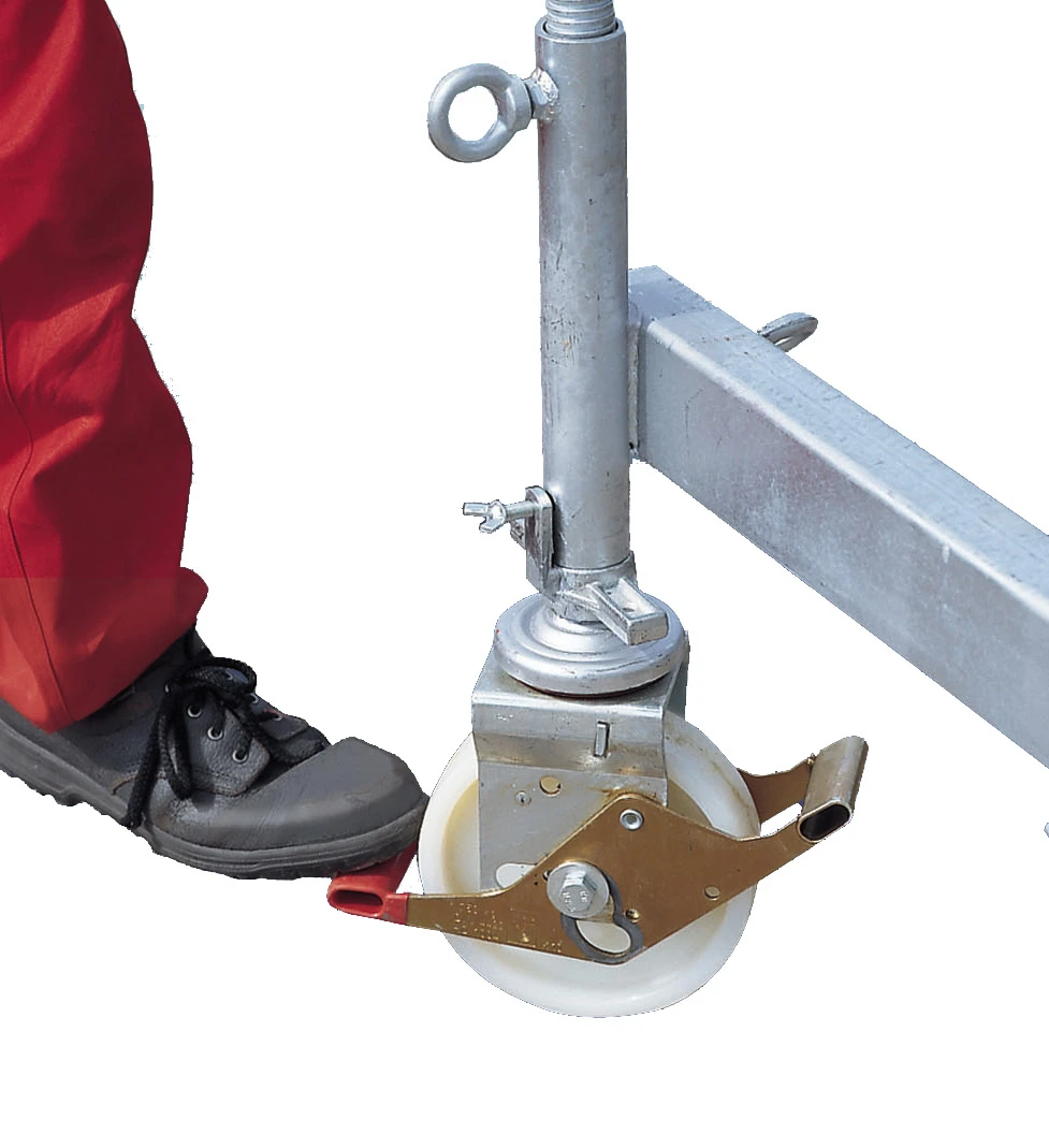 - Optional können bei allen Gerüsten die Lenkrollen mit Zapfen durch die Lenkrollen mit Spindeln oder Fußspindeln ersetzt werden. Damit können Höhenunterschiede bis zu 30 cm ausgeglichen werden
