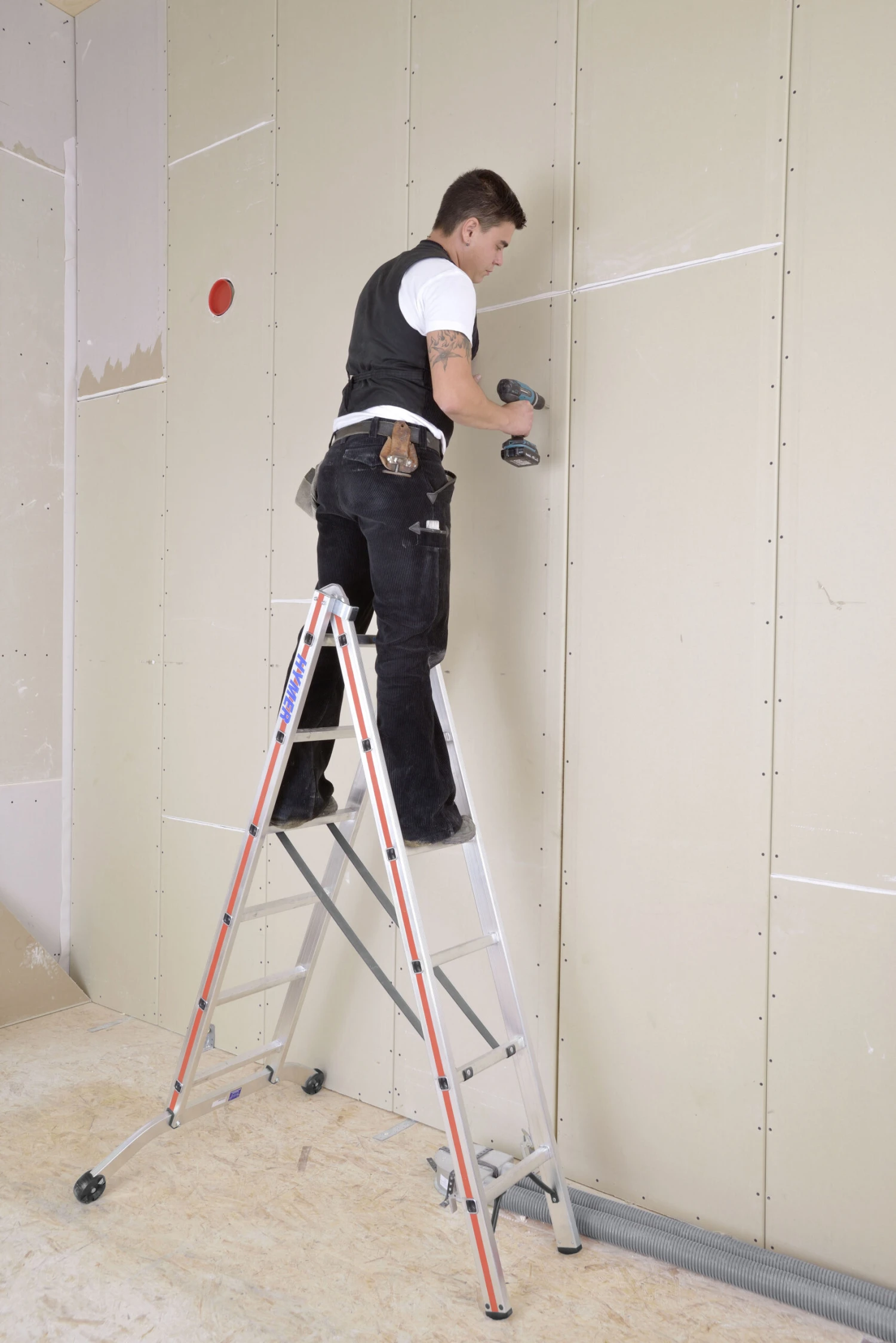 Hinweis: Zur TRBS-konformen Verwendung als Arbeitsplatz ist bei Sprossenleitern entsprechendes Zubehör wie Einhängetritte (Universal-Leitertritt klappbar) zu verwenden.