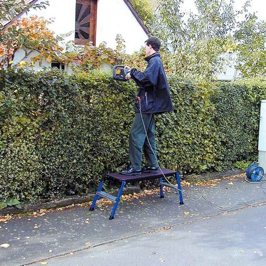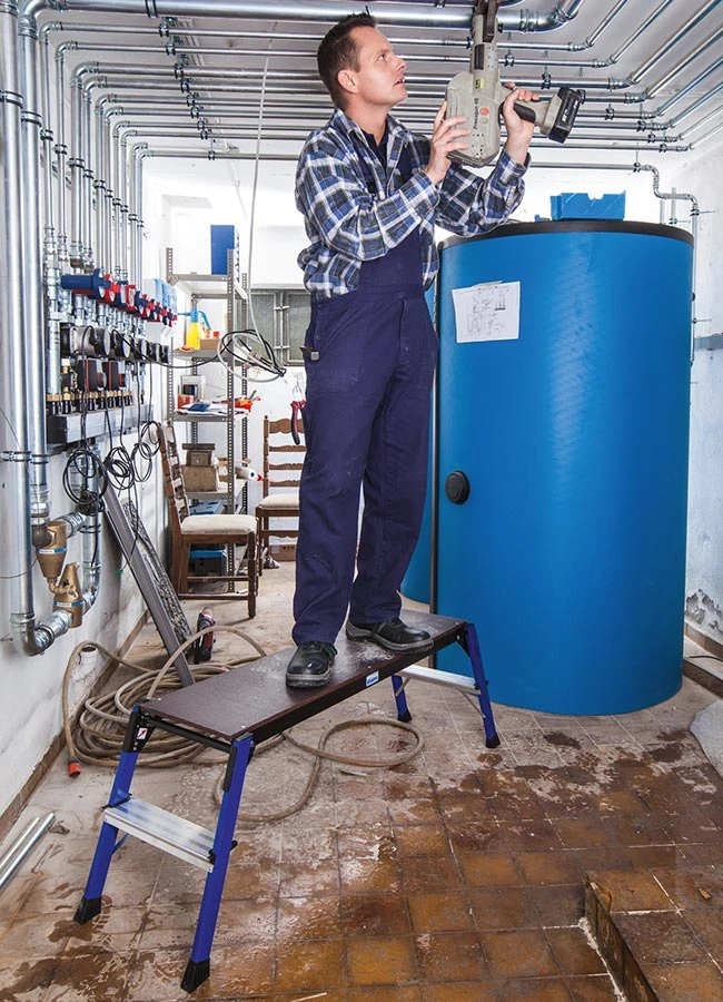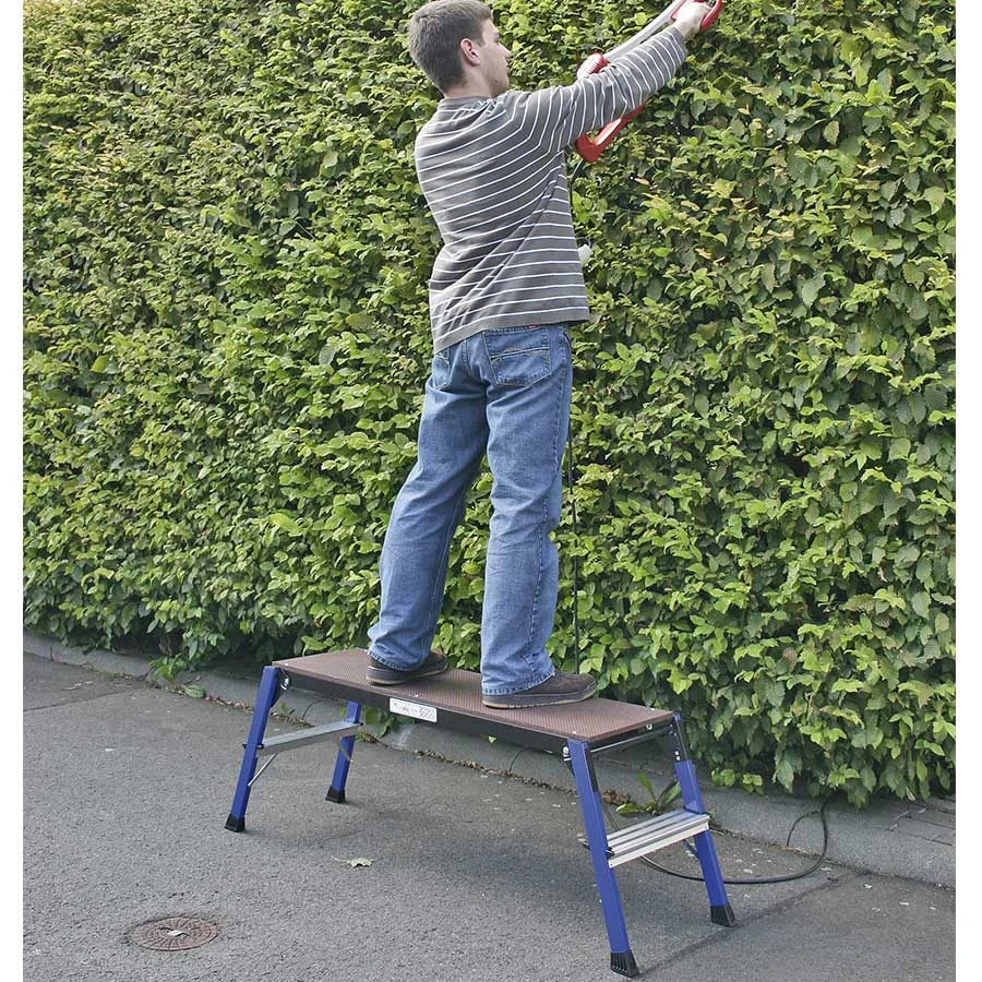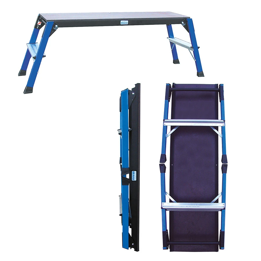 Die stabile Aluminium-Arbeitsplattform eignet sich ideal für Arbeiten, die eine große Standfläche benötigen und kann platzsparend zusammengeklappt werden.