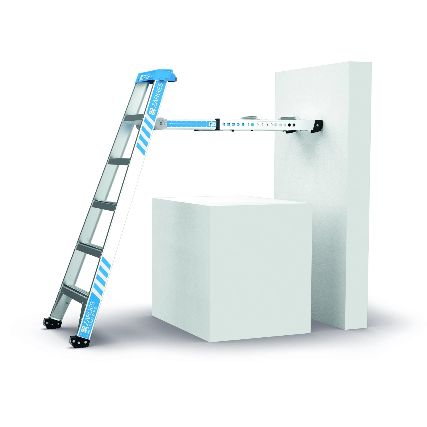 Eine Leiter, 5 Modi: Stehleiter, treppengängige Stehleiter, Anlegeleiter im Off-Set-Modus, Anlegeleiter sowie ausgefahrene Anlegeleiter in einem.