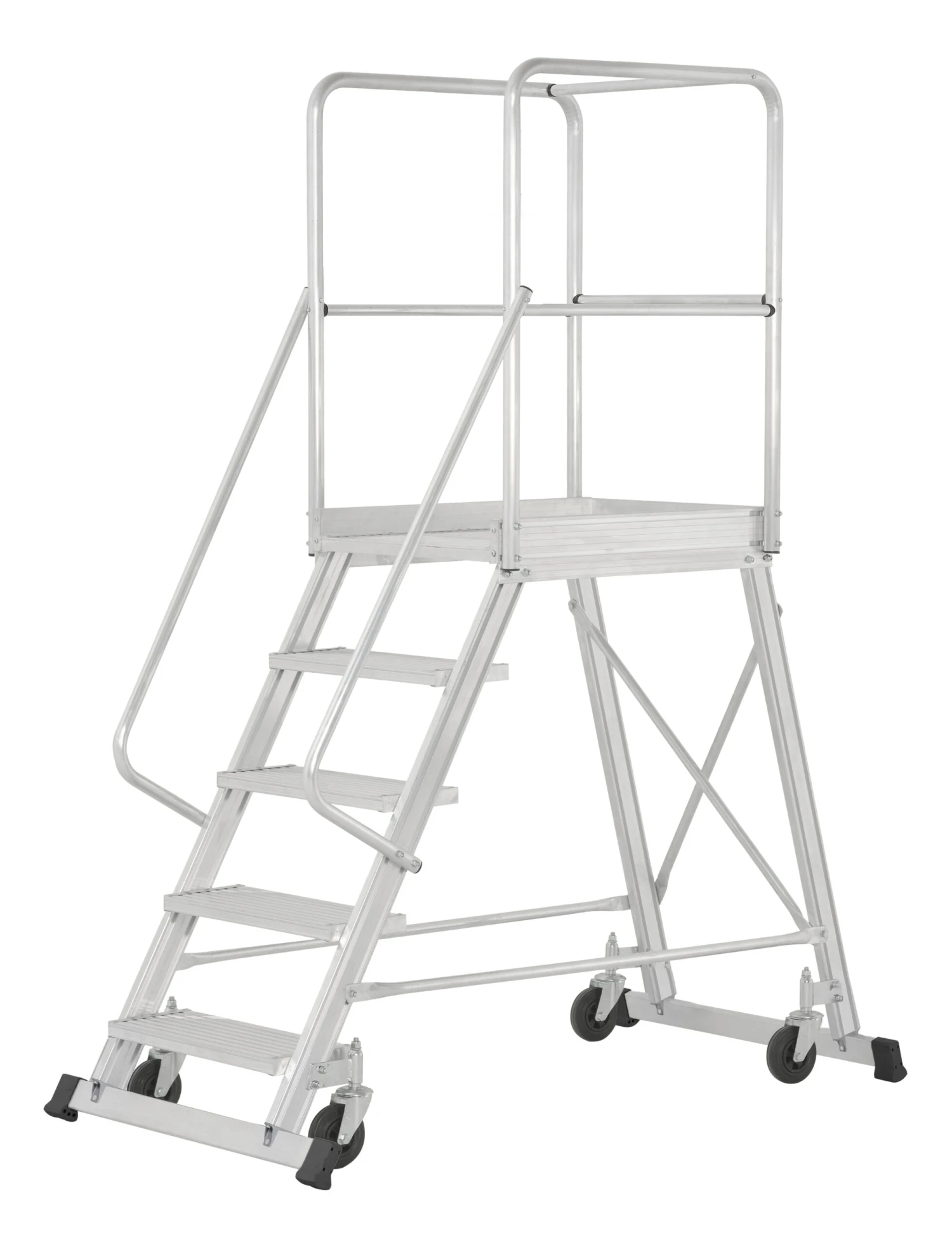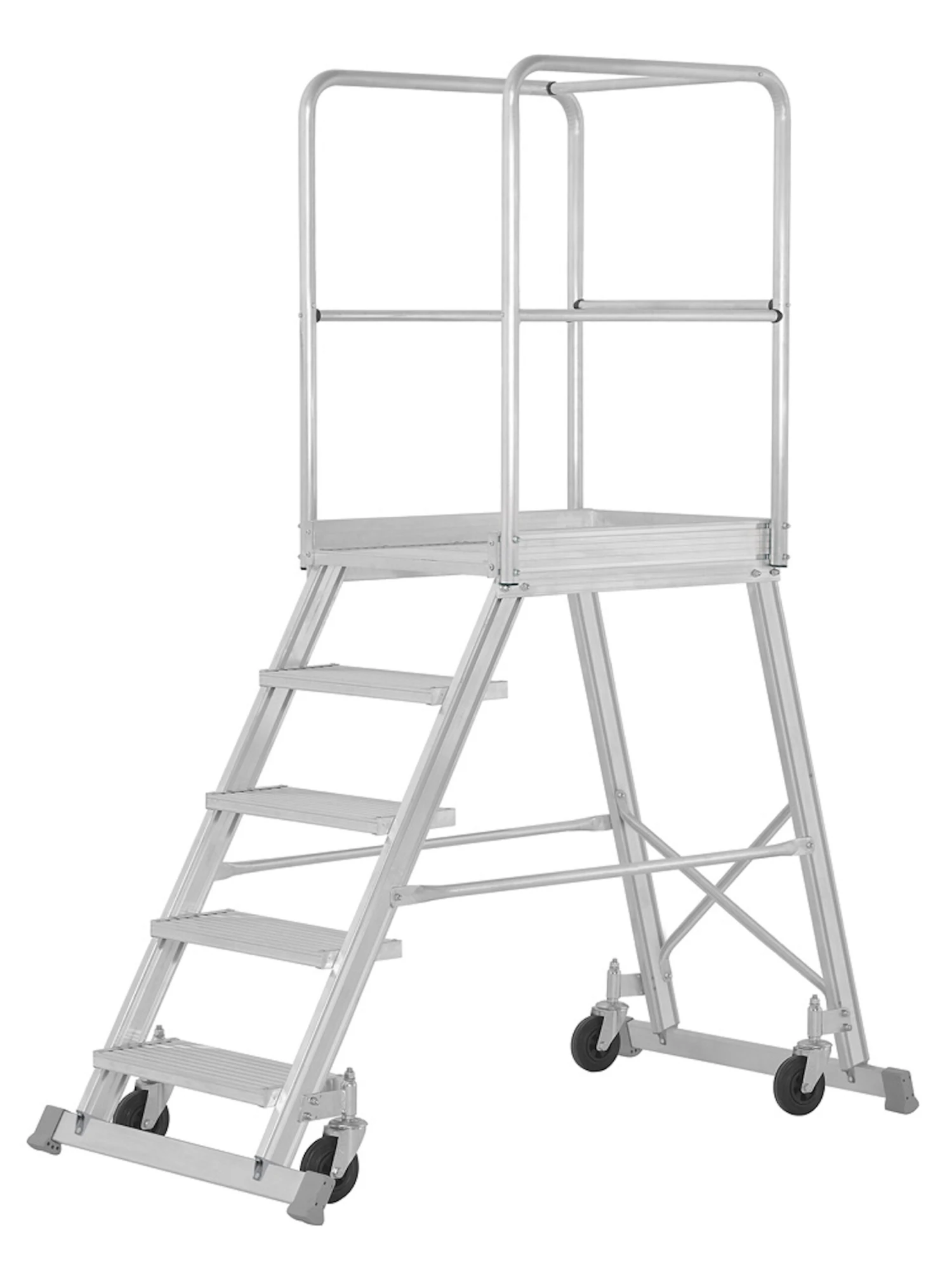 - 4 Federrollen (Durchmesser 125 mm), die beim Besteigen selbsttätig bremsen, davon 1 Federrolle am Leiterteil mit Feststellbremse zur Sicherung gegen Wegrollen, wenn das Podest nicht belastet ist