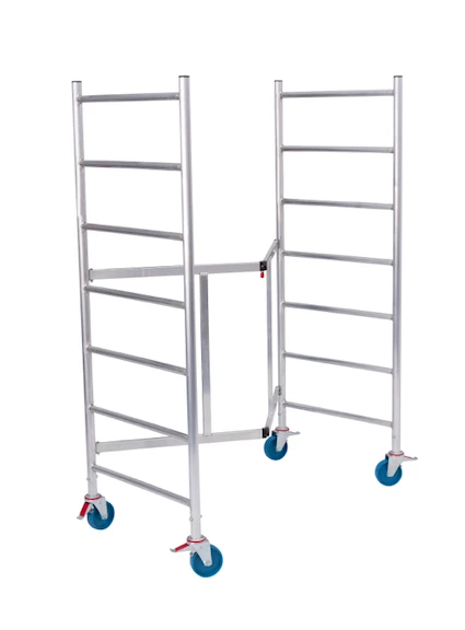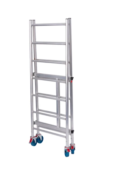 - Belagbühne mit leichtgängigem Schnellverschluss kann am zusammengeklappten Gerüst für den Transport und platzsparende Lagerung senkrecht eingehängt werden