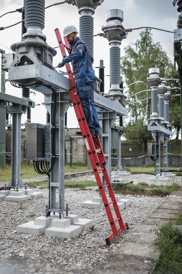 Schiebeleiter geprüft nach DIN EN 131. Die Ausführung berücksichtigt die EN 61478:2002 (Kat. 1:28.000 Volt).