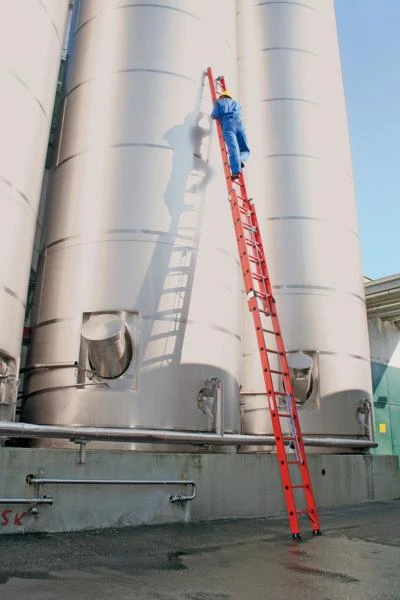 Schiebeleiter unter Berücksichtigung der DIN EN 131. Die Ausführung berücksichtigt die EN 61478:2002 (Kat. 1:28.000 Volt).