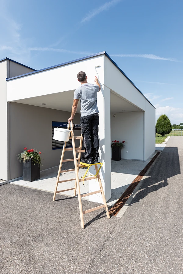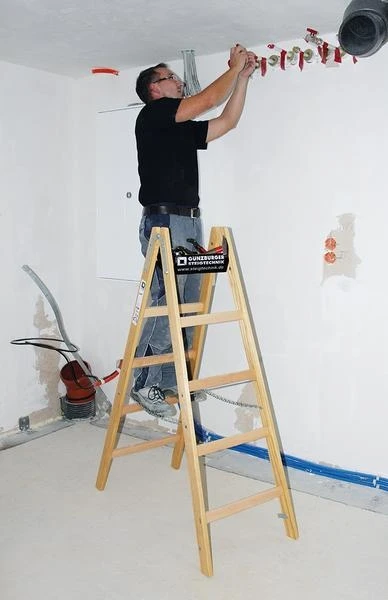 Nach TRBS 2121 Teil 2 wird zum Arbeiten auf dieser Leiter ein passendes Zubehör (Einhängepodest, Einhängetritt oder Stufenmodul) benötigt