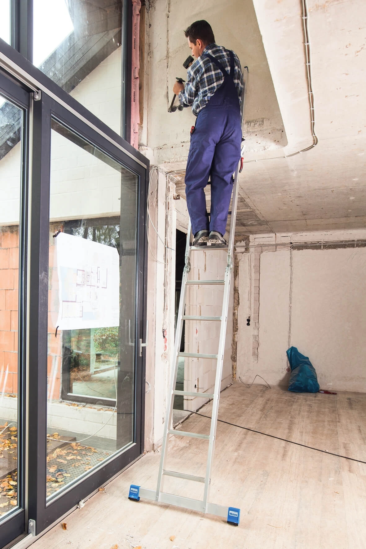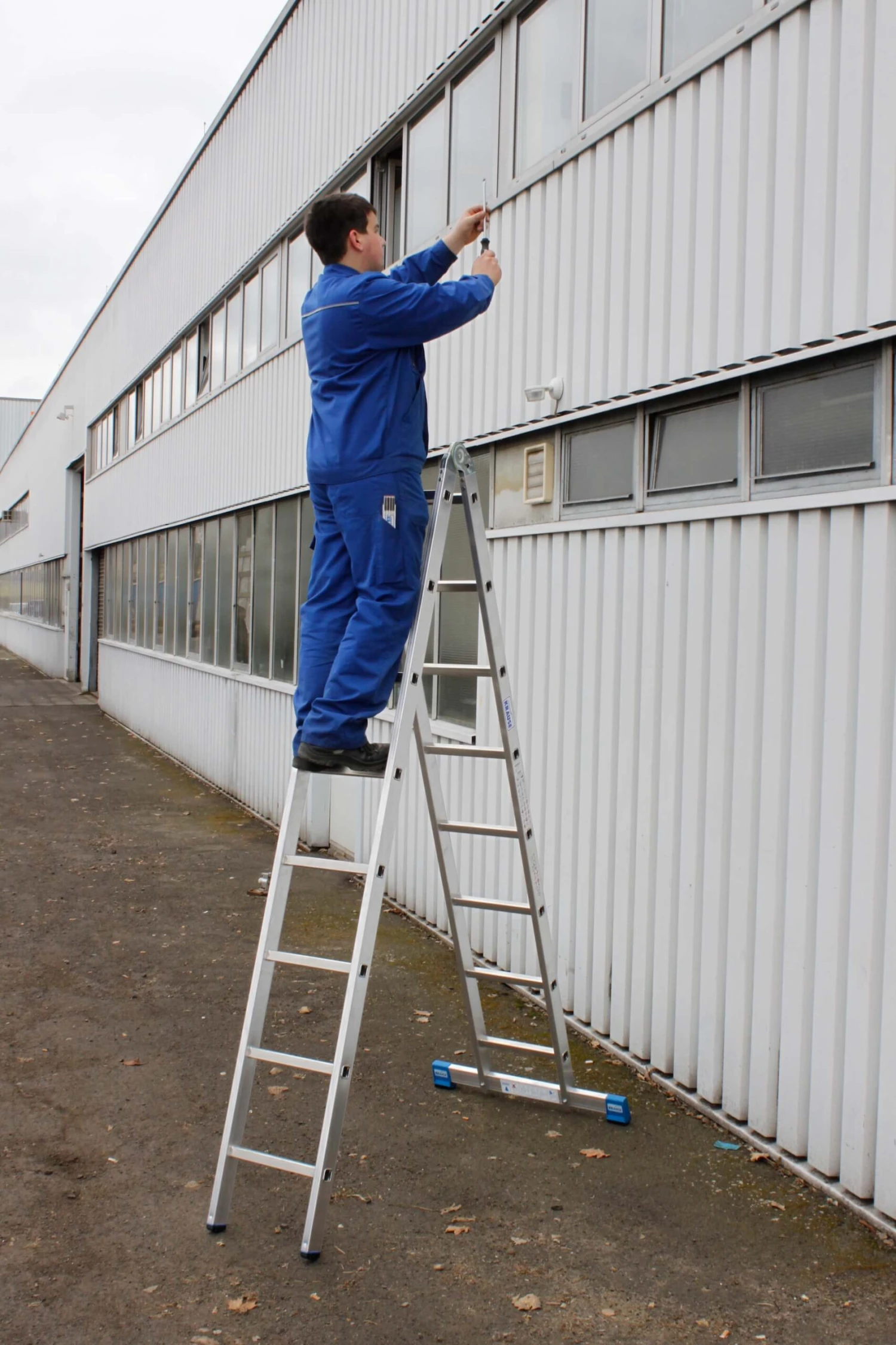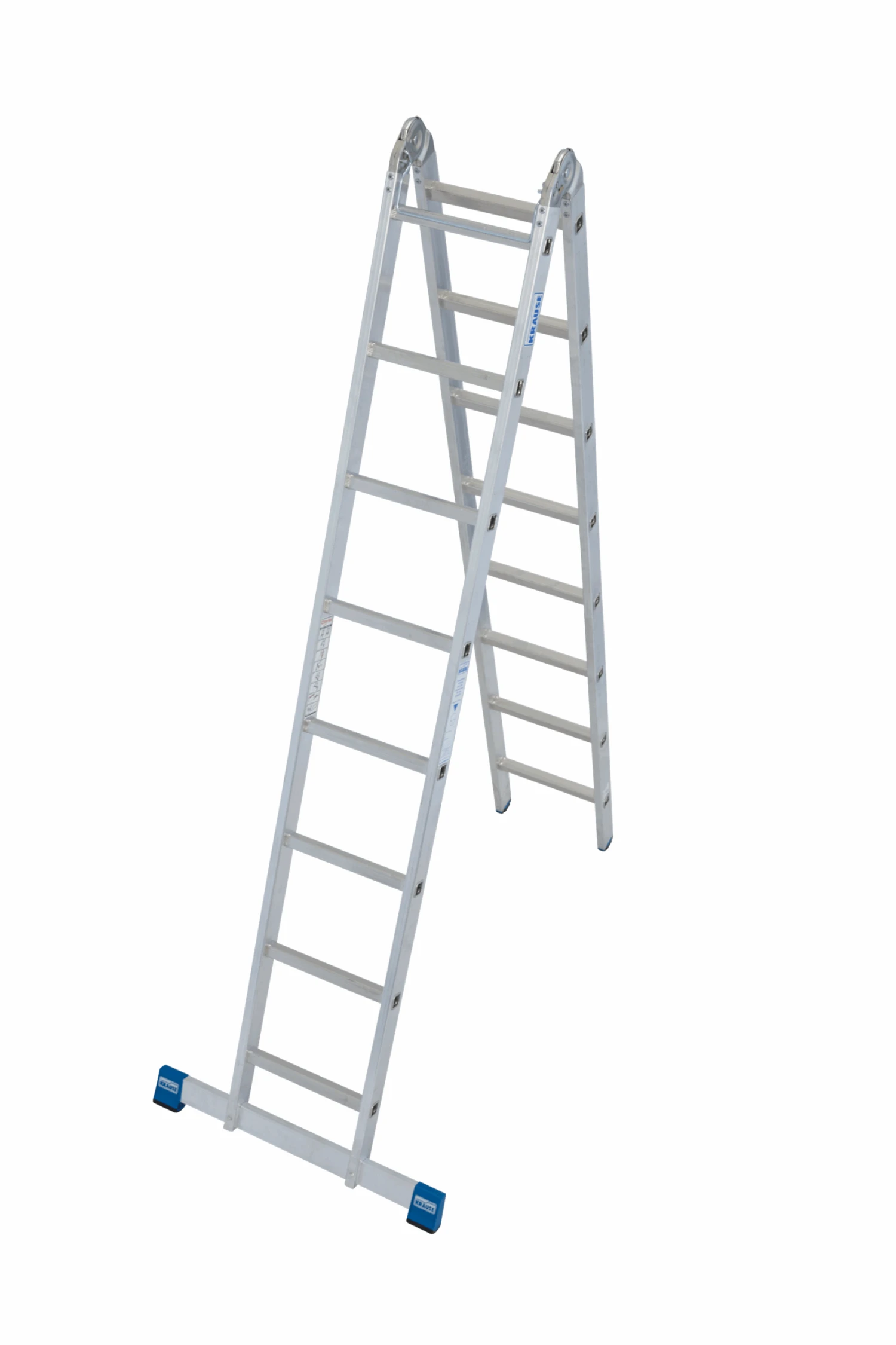 Professionelle, verstärkte Aluminium-Sprossen-Gelenk-Doppelleiter, die als Steh- und Anlegeleiter einsetzbar ist.