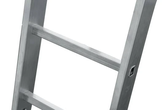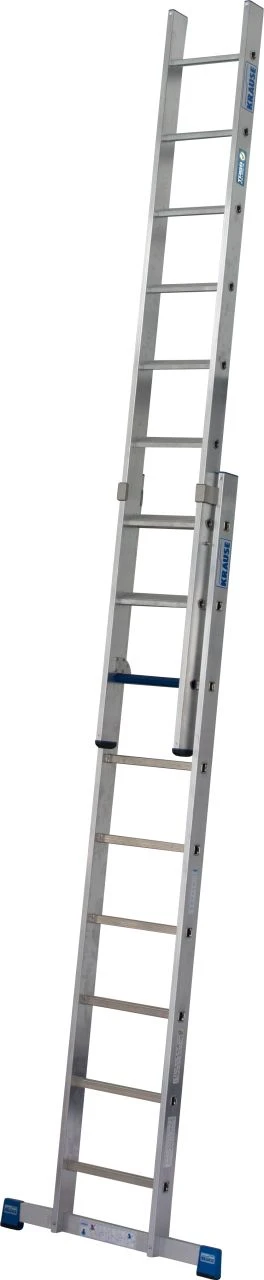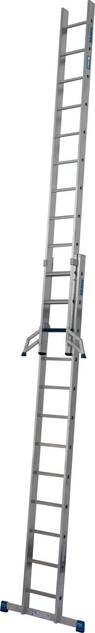- Ab der Ausführung 2×12 Sprossen/Stufen ist das Schiebeteil mit der Trigon-Traverse ausgestattet und kann im Gegensatz zu herkömmlichen Schiebeleitern entnommen werden