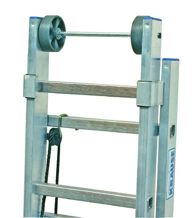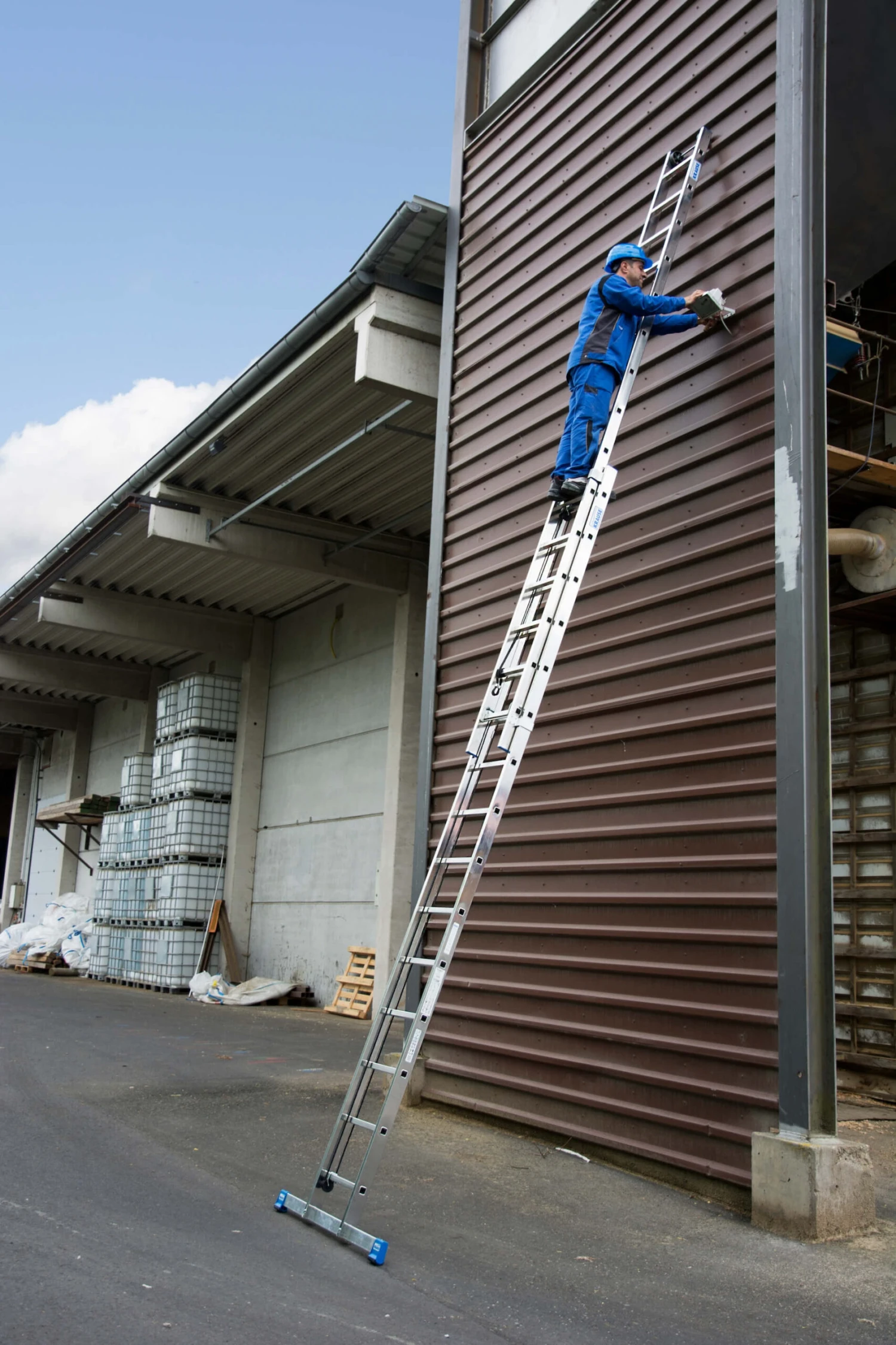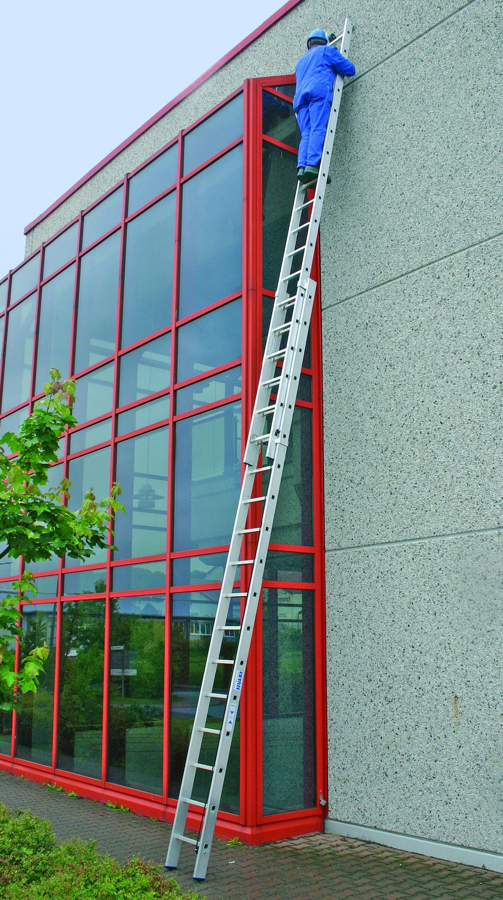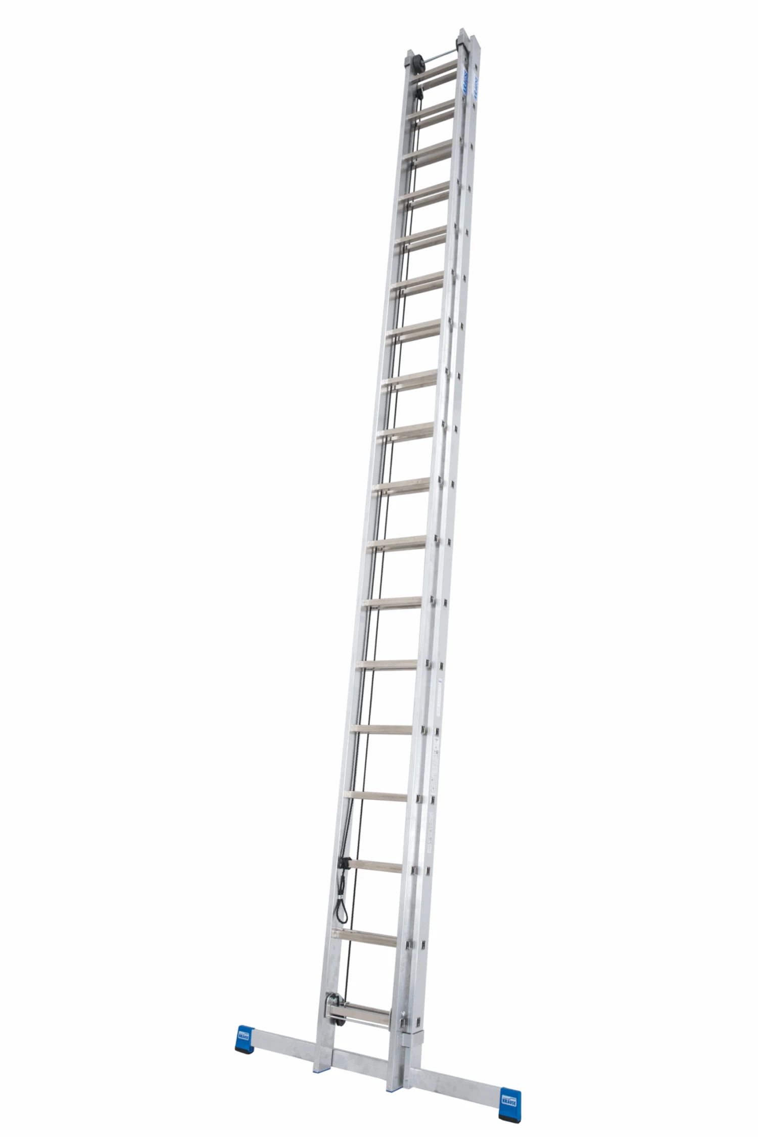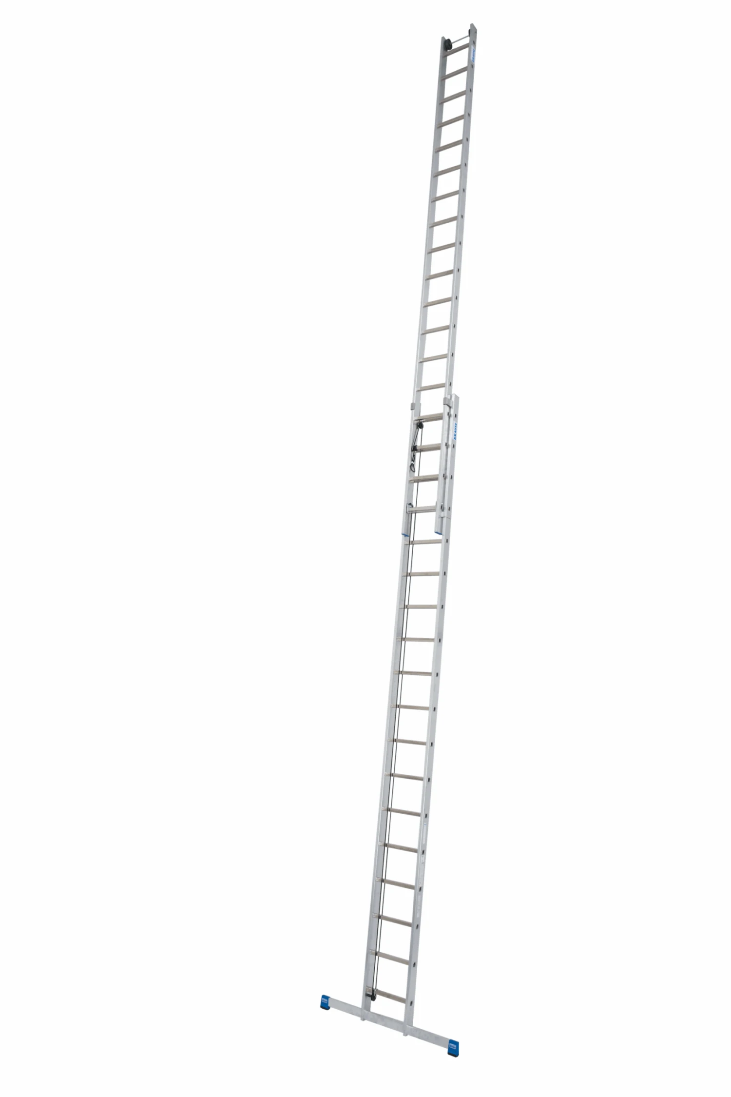 Zweiteilige Sprossen-Seilzugleiter für den professionellen Einsatz in großen Arbeitshöhen bis 13,10 m mit Wandlaufrollen zum komfortablen Ausfahren der Leiter.