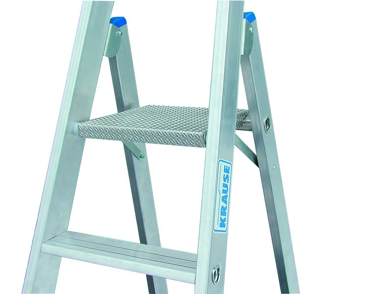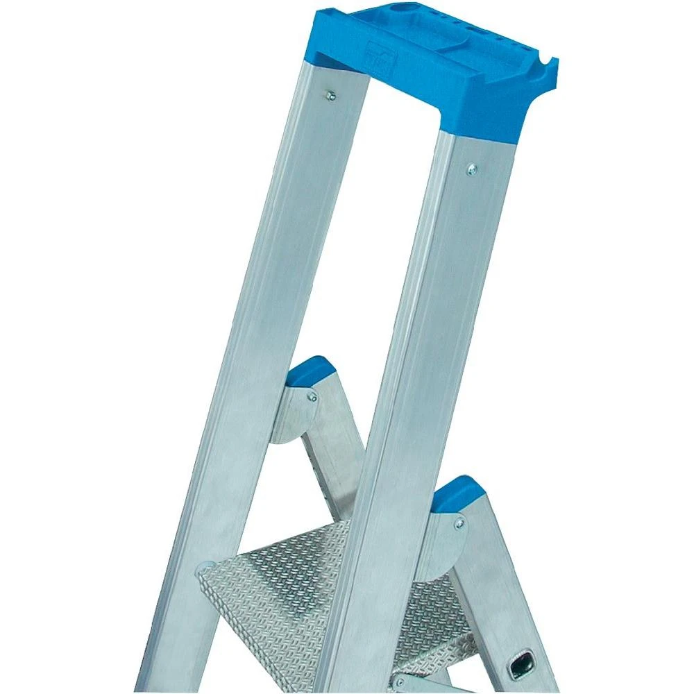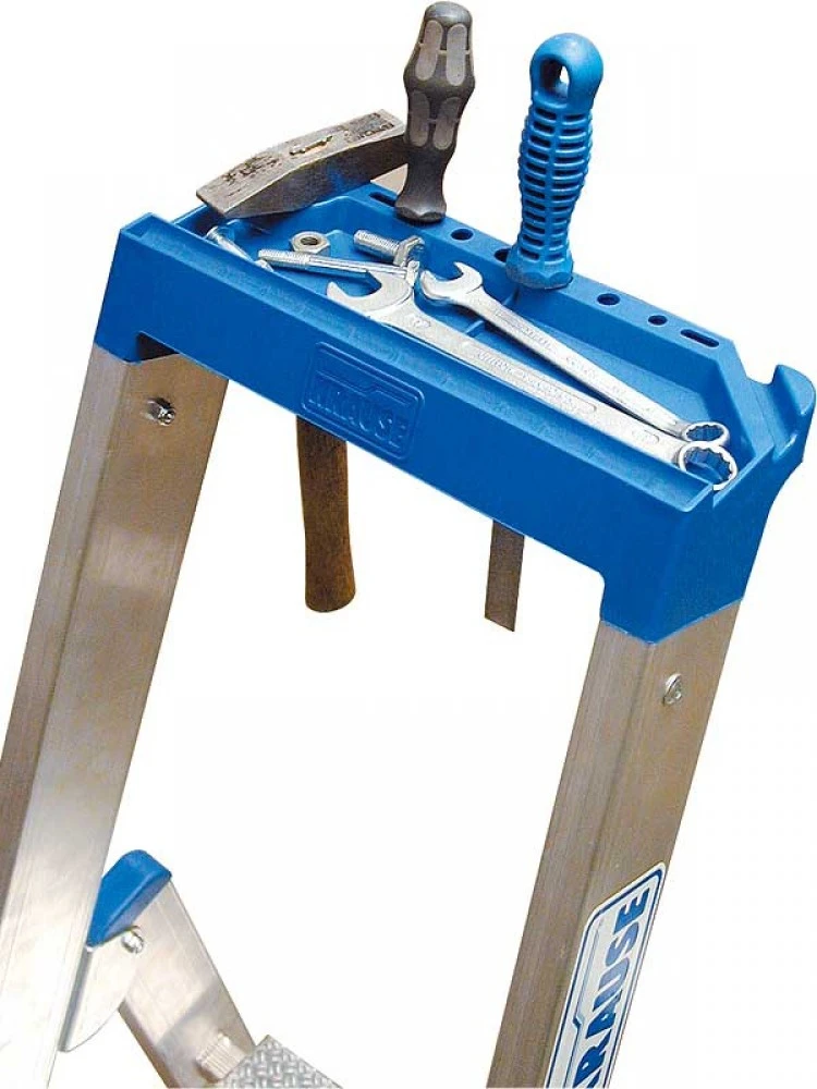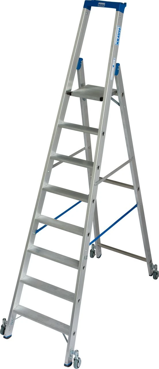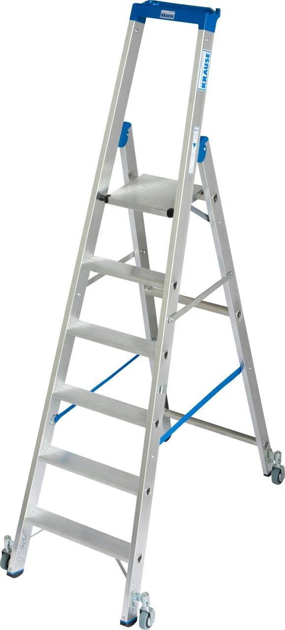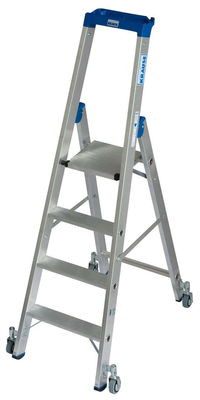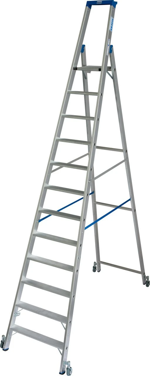 Die robuste Aluminium-Stehleiter mit Mulitfunktionsschale und Fahrrollen für den mobilen Einsatz.