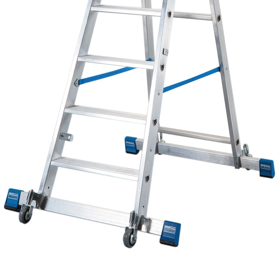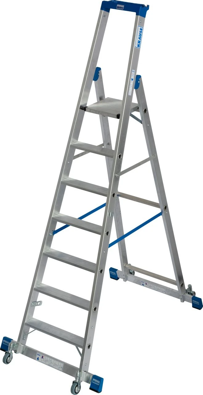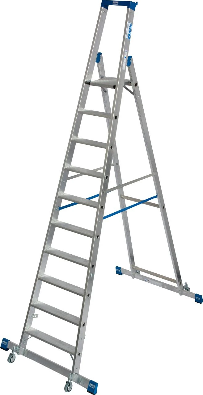 Die robuste, fahrbare Aluminium-Stehleiter mit Traversen für einfache Positionswechsel und hohe Standsicherheit mit praktischer Ablageschale für den professionellen Einsatz.