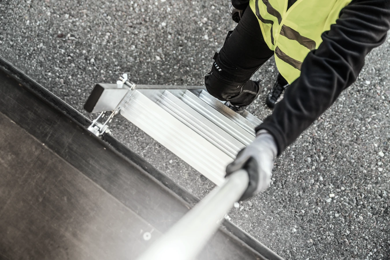 Stufen-Anlegeleiter LKW Mit Ausstiegsholm Links