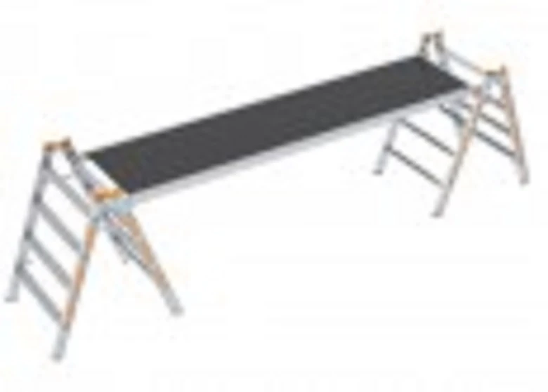 - Mit Rundsprossen auf einer Seite zum Einrasten von Fahrgerüst-Belagbrücken (0,68 m breit) oder 2 Alu-Telestegen als Arbeitsplattform.
