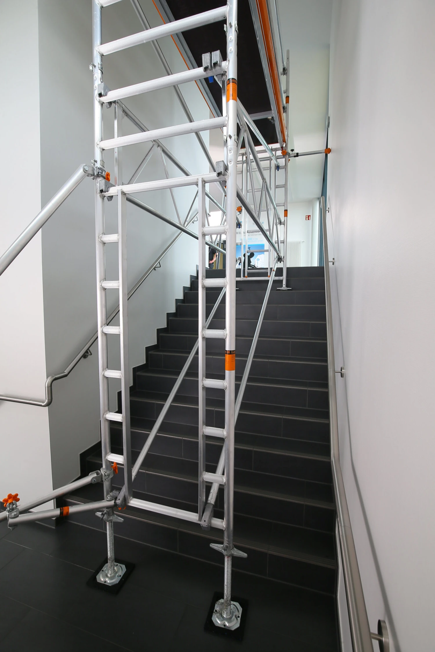 - Nach der Montage der Basis auf den Treppenstufen kann der Aufbau der benötigten Gerüstebenen mit dem bereits bewährten Sicherheitsaufbau P2 ausgeführt werden